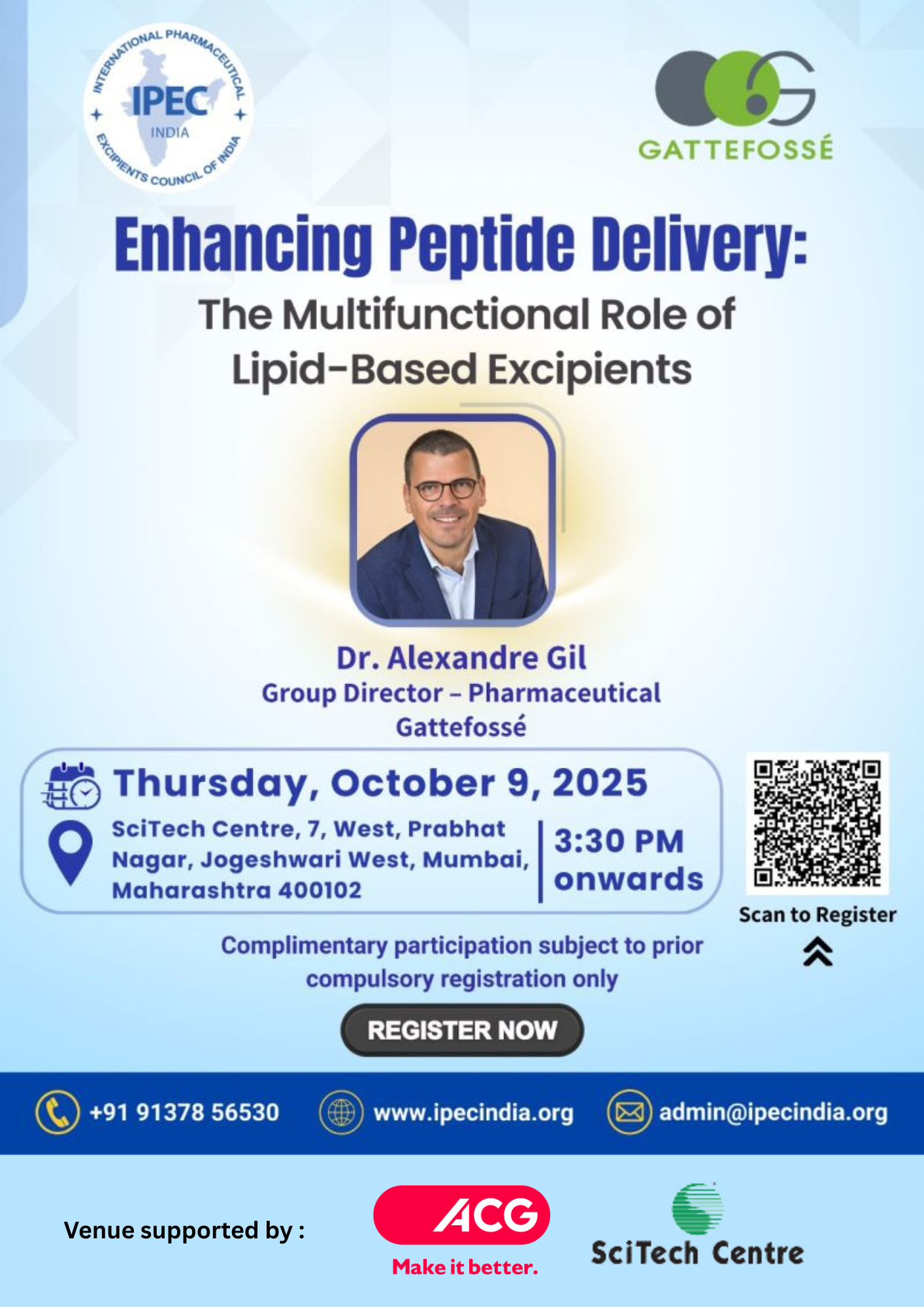 International Pharmaceutical Excipients Council of India (IPEC India) —a non-profit industry association, chaired by Mr Ajit Singh, is organizing a seminar on “Enhancing Peptide Delivery: The Multifunctional Role of Lipid-Based Excipients” by Dr. Alexandre Gil in Collaboration with Gattefosse India on Thursday, October 9, 2025 from 15:00 hrs onwards at Scitech Centre, 7, West, Prabhat Nagar, Jogeshwari West, Mumbai